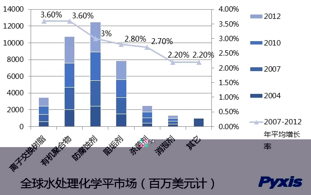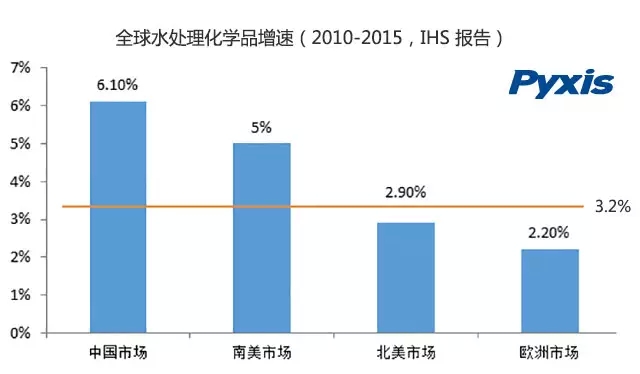 IHS化學公司日前的分析印證了這一點。其發布報告稱,2010~2015年,全球水處理化學品消費量將以年均3.2%速度增長,市場規模將達約1240億美元。其中,中國市場年均需、求增速約為6.1%,南美增速預計為5%,北美增速約為2.9%,歐洲增速約為2.2%。