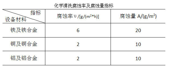 化學清洗時金屬腐蝕率和腐蝕量應不大于下表指標。