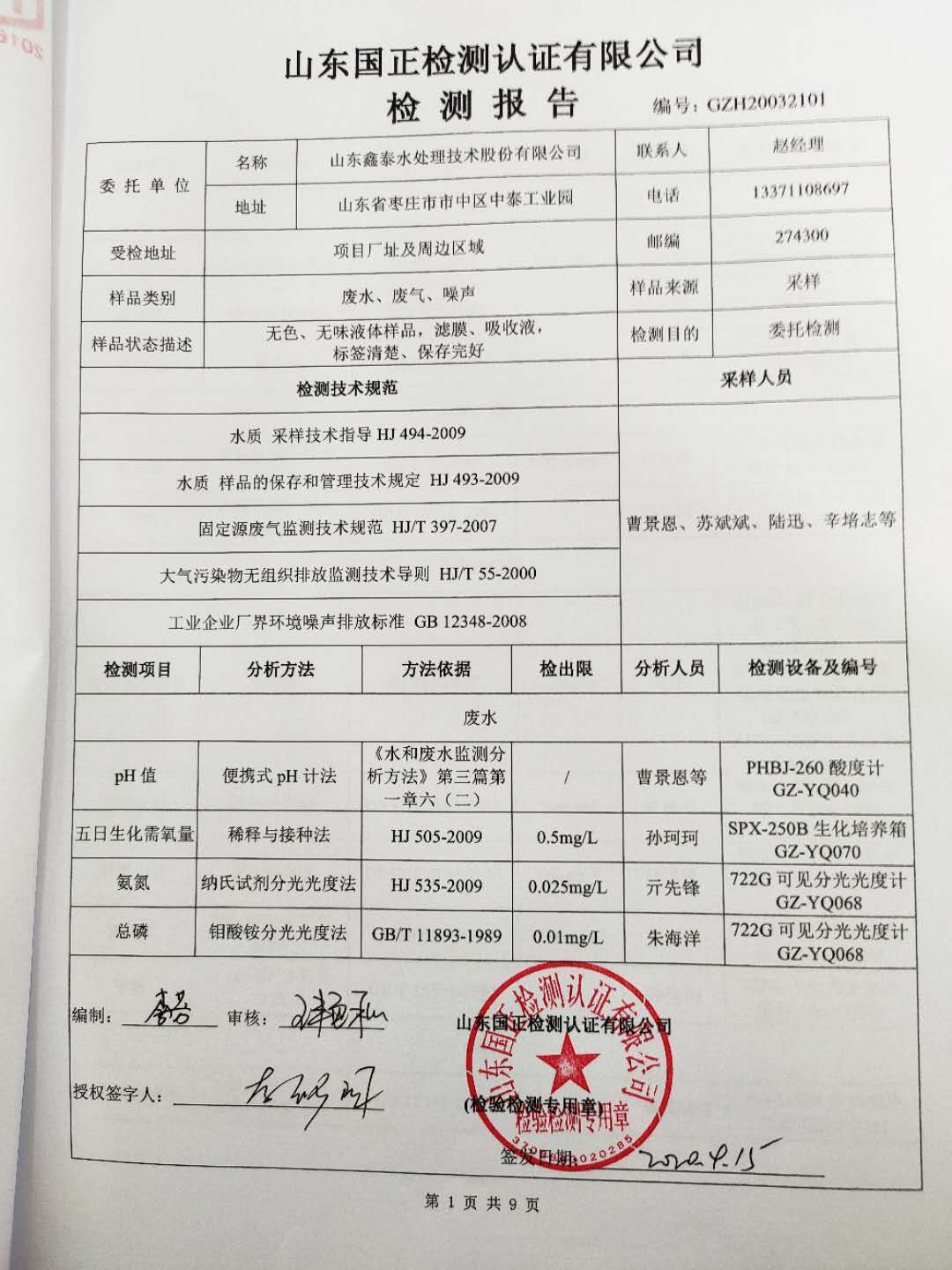 | 單位名稱 | 山東鑫泰水處理技術股份有限公司 | |||